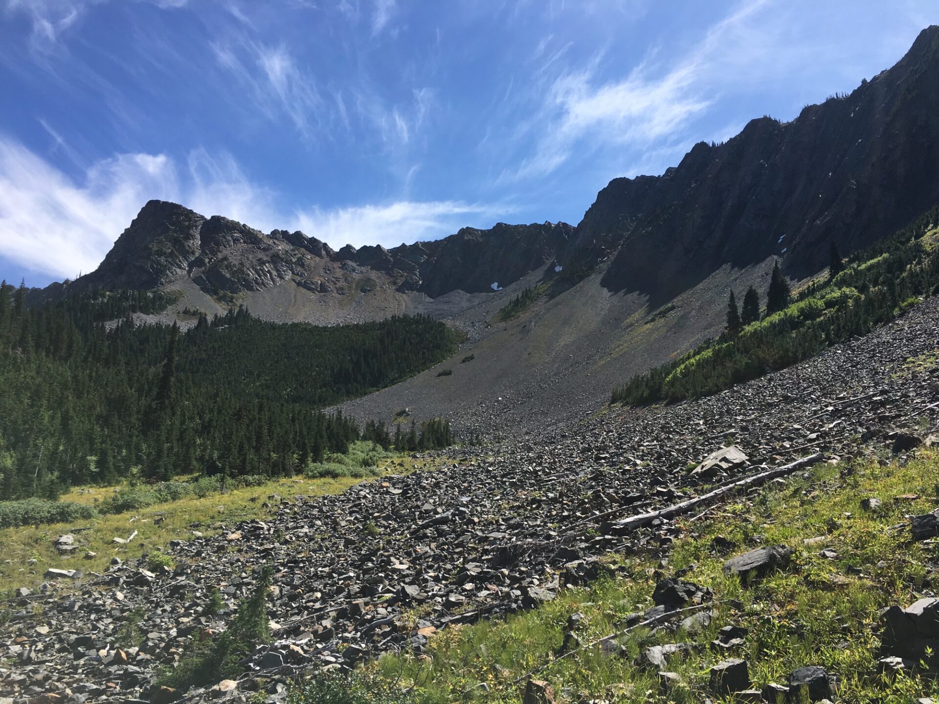 After Devils Pass, the trail passes through surprisingly lush forest before breaking out into another rocky basin with a climb up to a shoulder between peaks 6881 and 6402. As I continued up, sheer whistles broke the silence and I knew it was only one thing: mountain marmots!