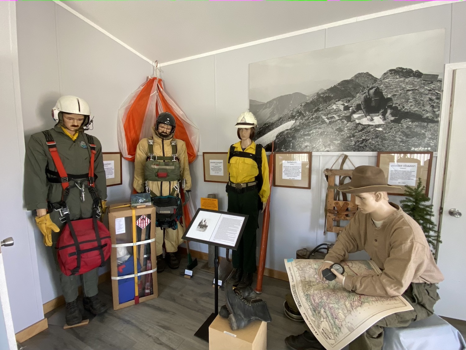 The Columbia Breaks Fire Interpretive Center near Entiat was first conceived as a way to relocate and save the Chelan Butte fire lookout. In 1990, Nancy Belt, an assistant fire dispatcher for the Wenatchee National Forest, received a Forest Service grant to study the feasibility of the idea and it grew into a much larger project. The Interpretive Center is now home to three relocated lookouts: Chelan Butte, East Flattop, and Badger Mountain, as well as a beautiful Firefighter Memorial Trail, an interpretive garden, and small amphitheater. The Center hosts a wide array of educational information about fire and plant ecology, fire behavior, history, and management, and has some nice fire memorabilia and displays.
