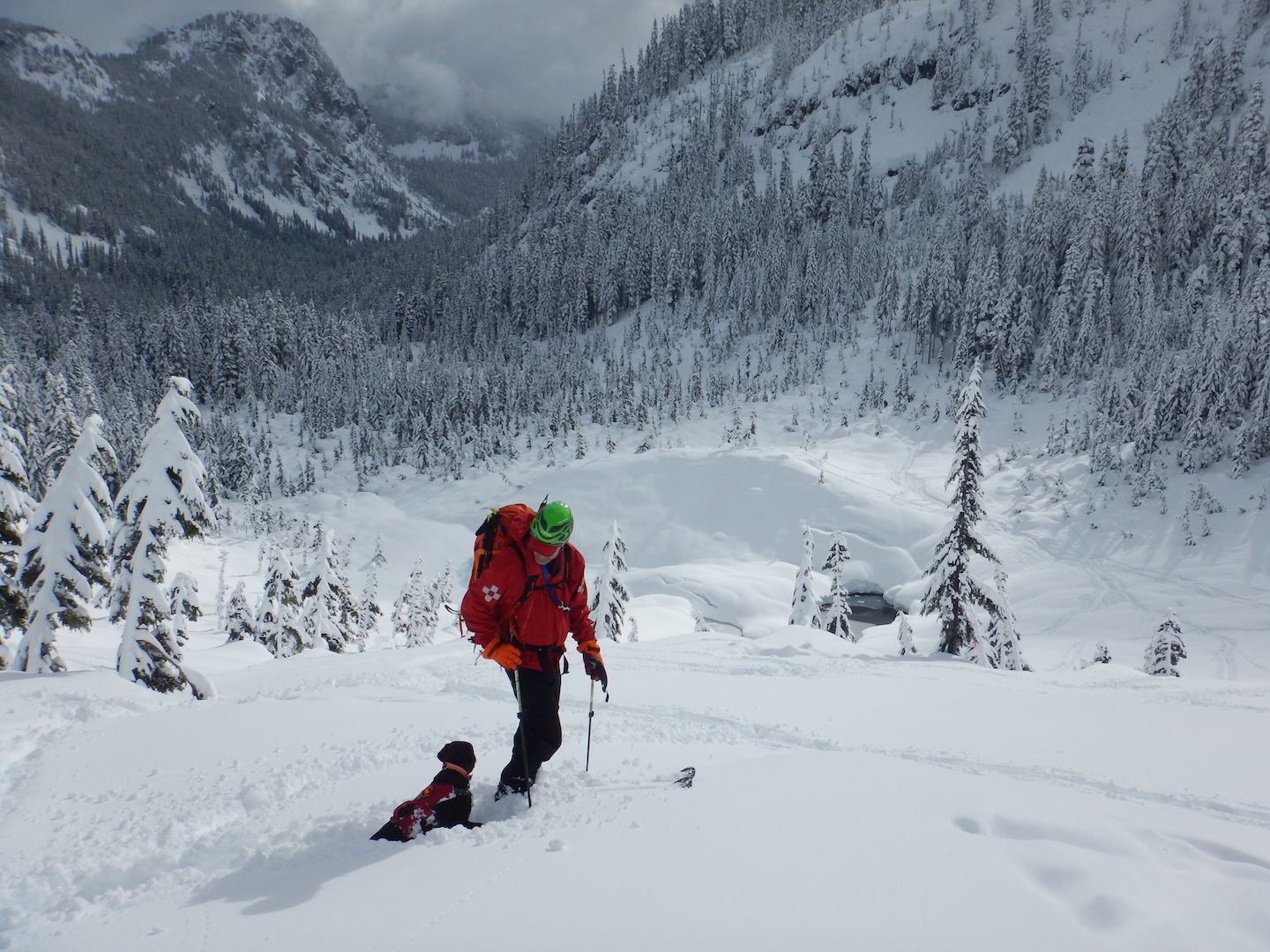 Early Saturday morning, I met my friends Scott and Ian at Alpental along with our SMR point person. He had staged the training site at Source Lake and would safely guide us to it. This location in winter does have real, live avalanche danger and with a fair amount of snow the day before we welcomed an experienced escort. The morning was also a great reminder of why early starts are well worth it: we broke trail through gorgeous fresh snow all the way to the lake!