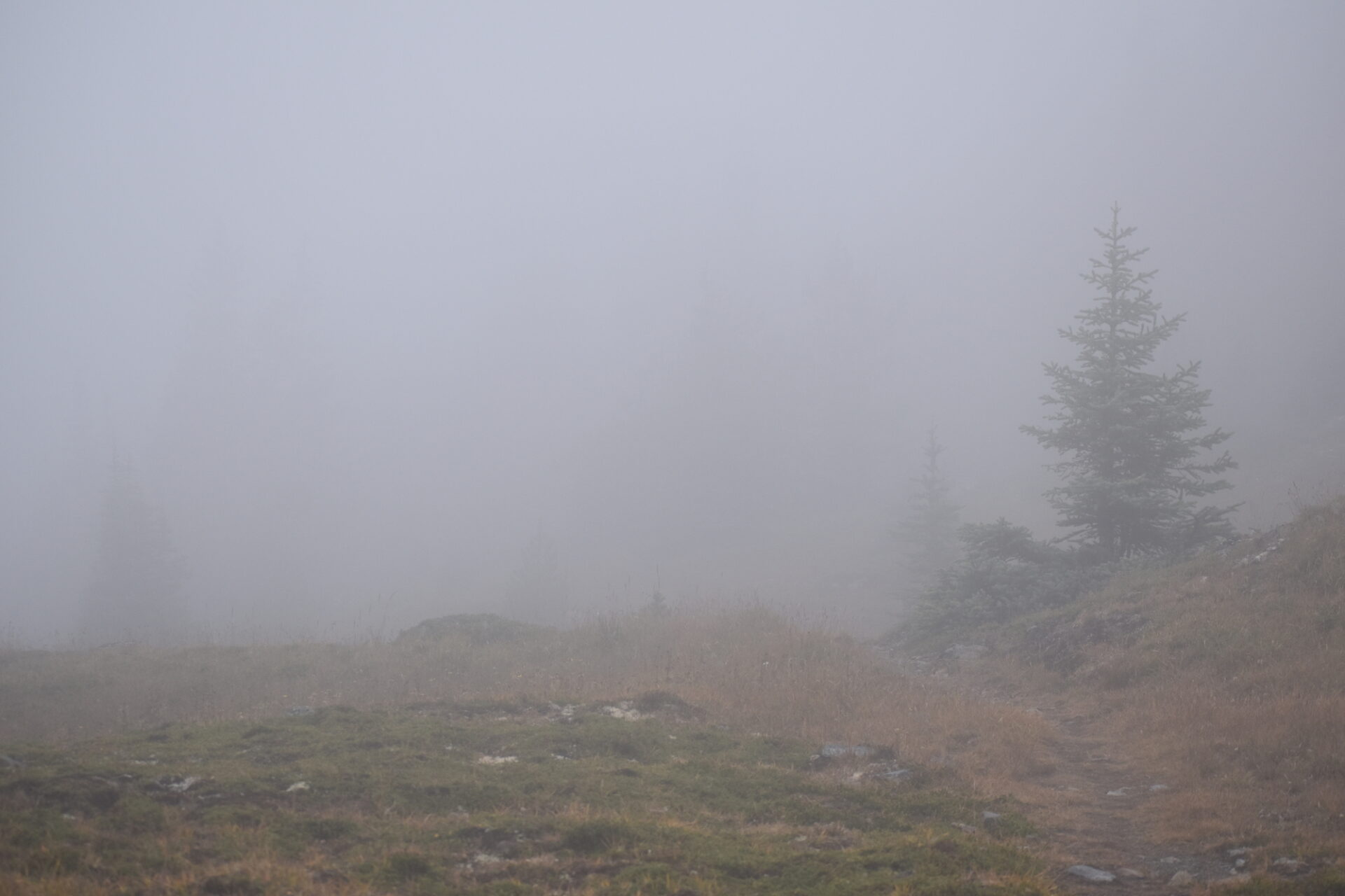 I awoke at 5:45am, when I was hoping to get up, pack camp, and start my long descent. It was still raining steadily with gusty winds. I peeked out from under my rain fly and the summit was enveloped in a thick fog.
