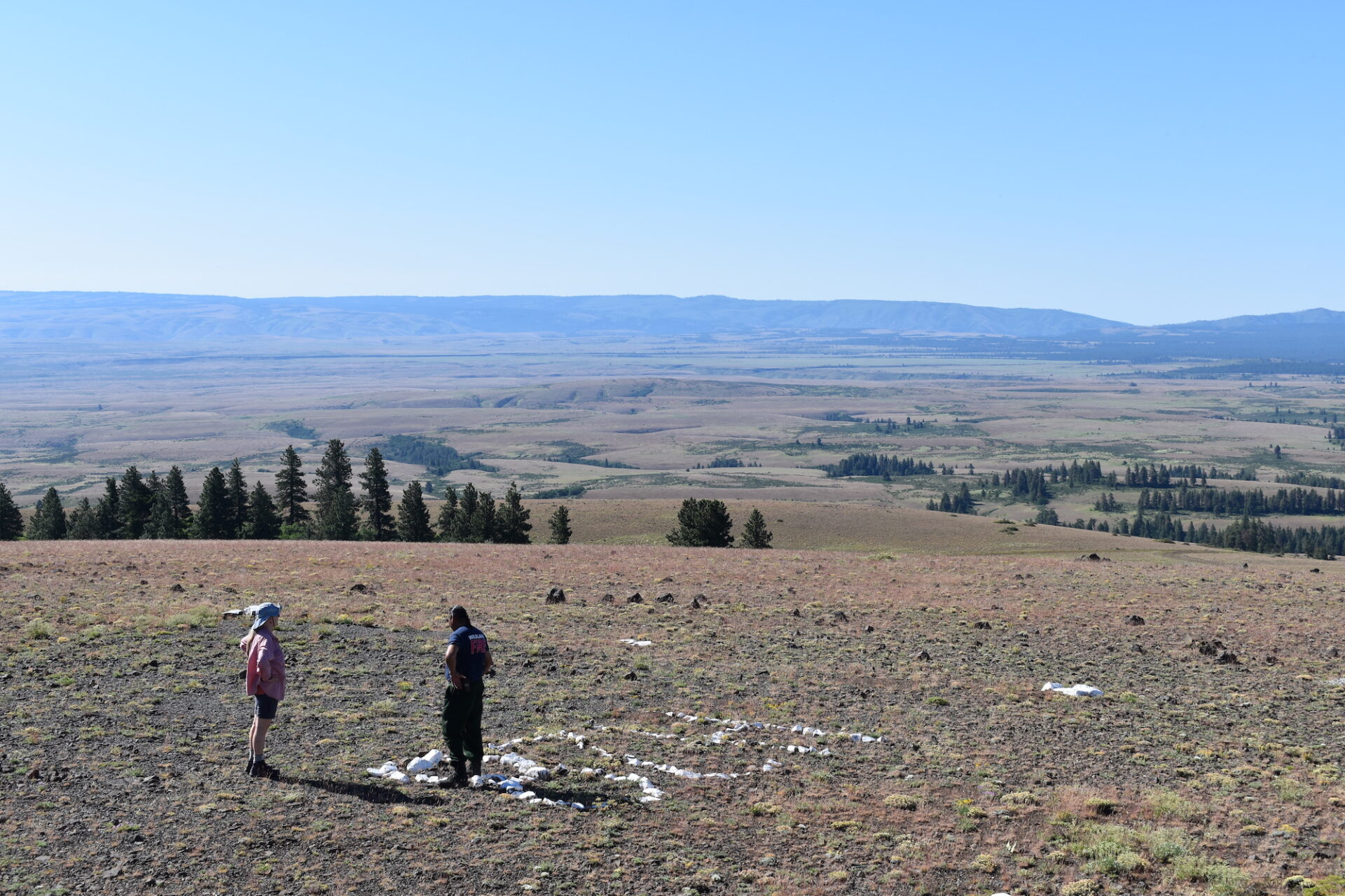 Armed with our work permits, we boarded a white cargo van arranged for us by our guides and off we went. Our permits were reviewed and accepted at the Mill Creek guard station and soon after, we were bumping along the rough, rocky road to Satus Peak. Along the way, Arnold and David spoke of wild horses, showed us points of interest, and shared stories about the land. We drove through an area named Starvation Flats, which contained ancient trails from the late 1800s.
