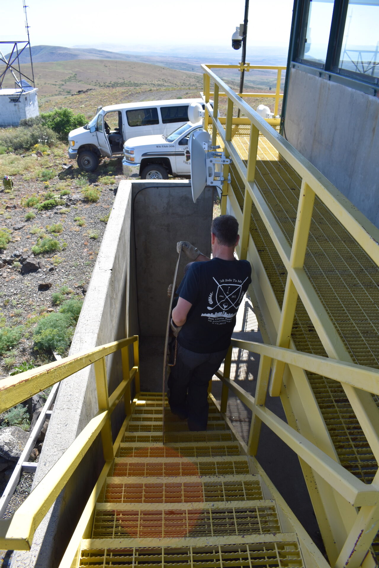 After some sightseeing and stories, it was time to get to work, which required removing 16 of the solid steel panels securing the lookout windows. Brian explained to us that securing buildings against vandalism is taken seriously on the reservation and each panel was easily 60+ lbs.