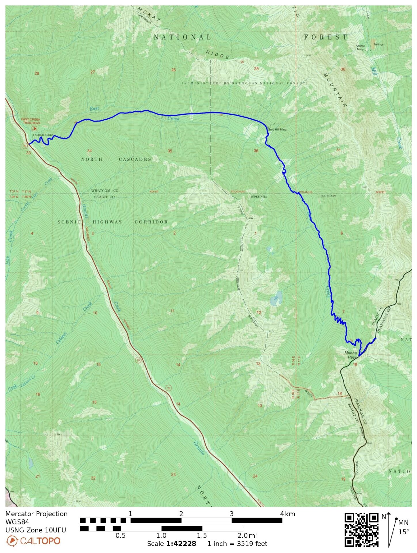 The primary route to Mebee Pass starts from the East Creek Trailhead roughly three miles to the east of the Canyon Creek Trailhead on Highway 20. The trailhead is 35 miles west of Mazama and about 24 miles east of Newhalem.
