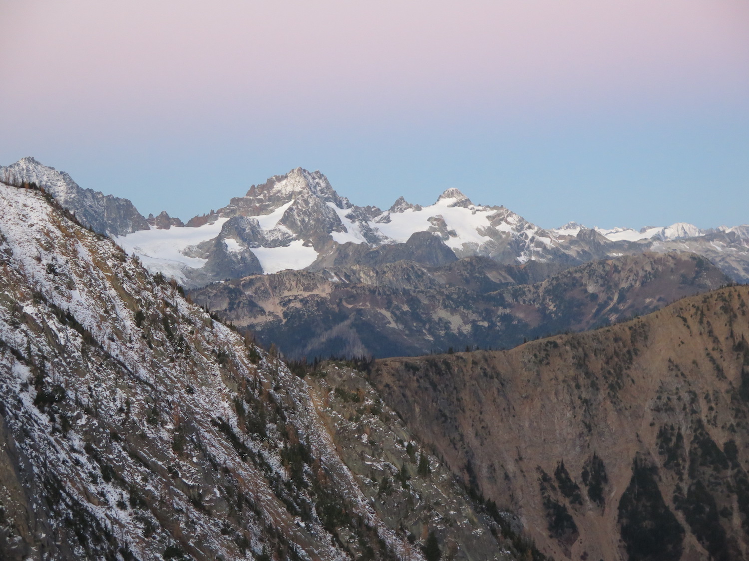 Our goal when visiting Mebee was to overnight on the summit but unfortunately it took much longer than expected to get there. With darkness fast approaching, we weren’t confident about safely routefinding up the last bit of steep terrain so we pitched my tent into the only tiny, somewhat flat spot we could find on the steep slopes below Mebee. That night the single digit temps were brutal but I’ve never seen a more glorious daybreak than in this remote area of the North Cascades. Pre-dawn with a fresh dusting of snow on the Methow Pinnacles was absolutely stunning!