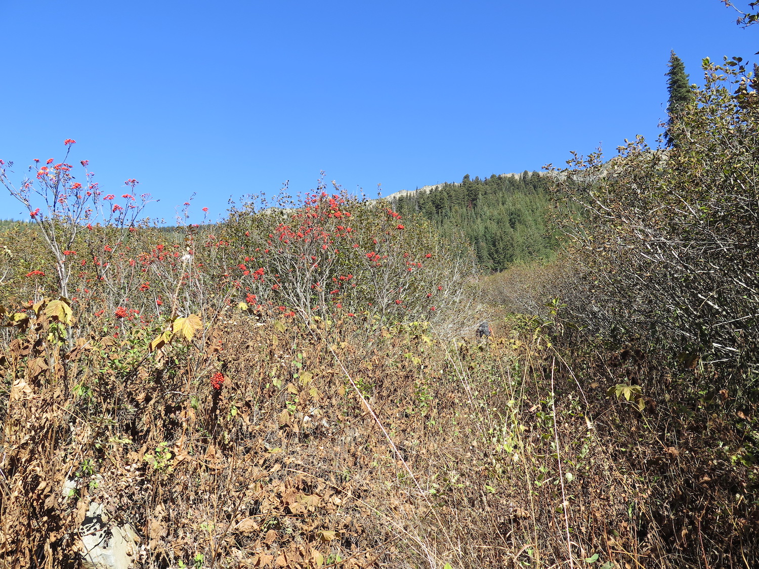 After the mine junction the trail gets a lot harder to follow and eventually disappears into a tangled mess of slide alder and avalanche and slide debris. Trail maps won’t help here since the trail has been obliterated. Some people have dropped down all the way to East Creek. I was able to head down slope maybe 50′ or so and find a faint trail across the slope that headed back into the forest. It sounds like this section is now heavily flagged so the route-finding may no longer be an issue.