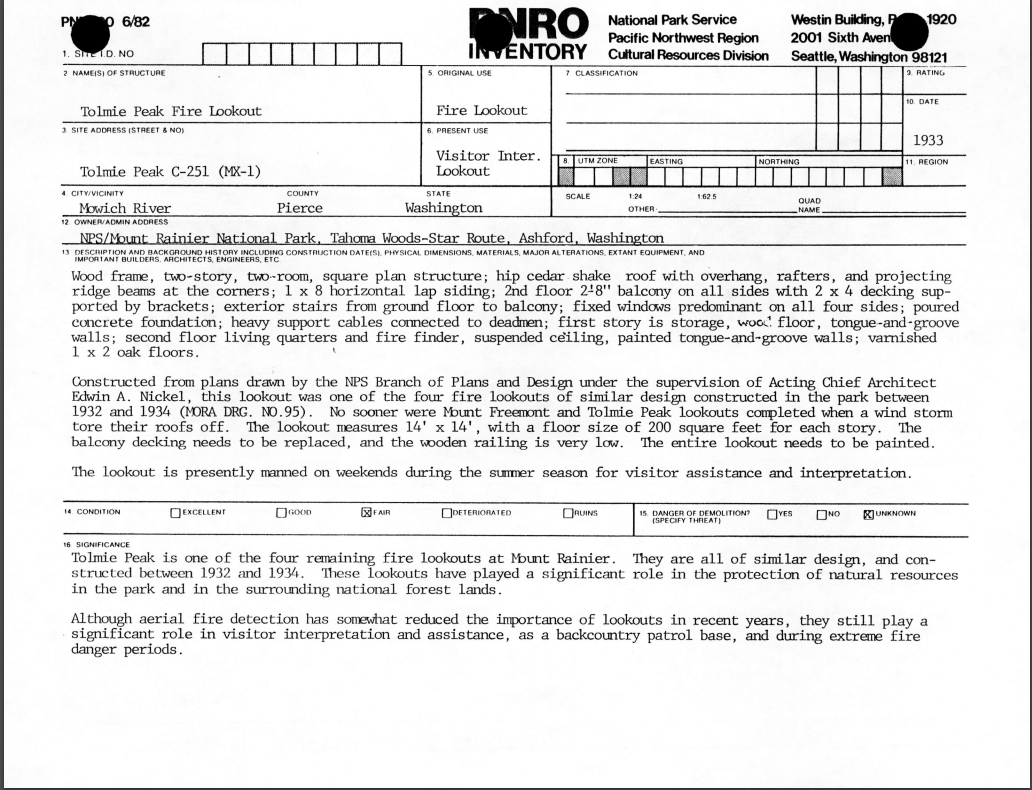The Tolmie fire lookout was placed on the National Register of Historic Places in March 1991 and is sometimes volunteer staffed in the summer.